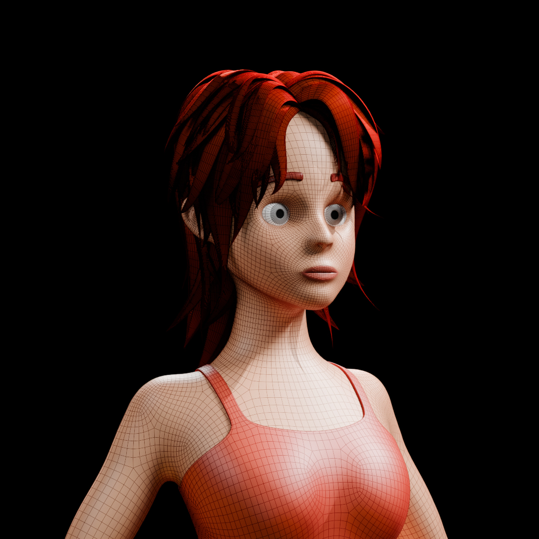 • Hair Design: The layered red hair was modeled manually for full control over shape and flow.